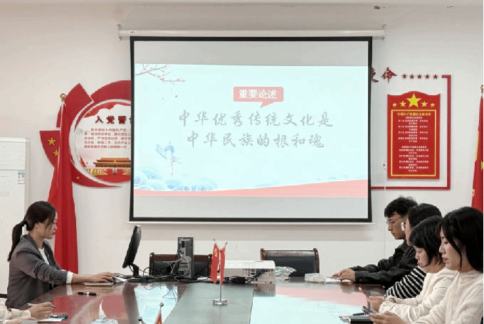 首先,教师刘念带领支部全体党员和入党积极分子学习习近平总书记关于中华文化传承的重要指示,分别从中华优秀传统文化是中华民族的精神命脉,中国共产党人始终是中国优秀传统文化的忠实继承者和弘扬者,推动中华优秀传统文化创造性转化、创新性发展、激活其生命力这三个方面进行阐述。她强调党员同志应当大力弘扬并传承中华优秀传统文化,切实增强民族自信心与自豪感。