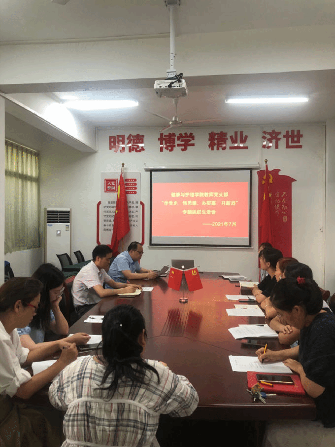2021年7月8日下午在无锡太湖学院健康与护理学院二楼会议室召开健康与护理学院教师党支部 “学党史,悟思想,办实事,开新局“专题组织生活会,无锡太湖学院校党委委员,健康与护理学院教学副院长周鸣鸣参加会议并讲话,健康与护理学院教师党支部书记宋绍征同志主持会议,以及健康与护理学院全体教师党员参加会议。